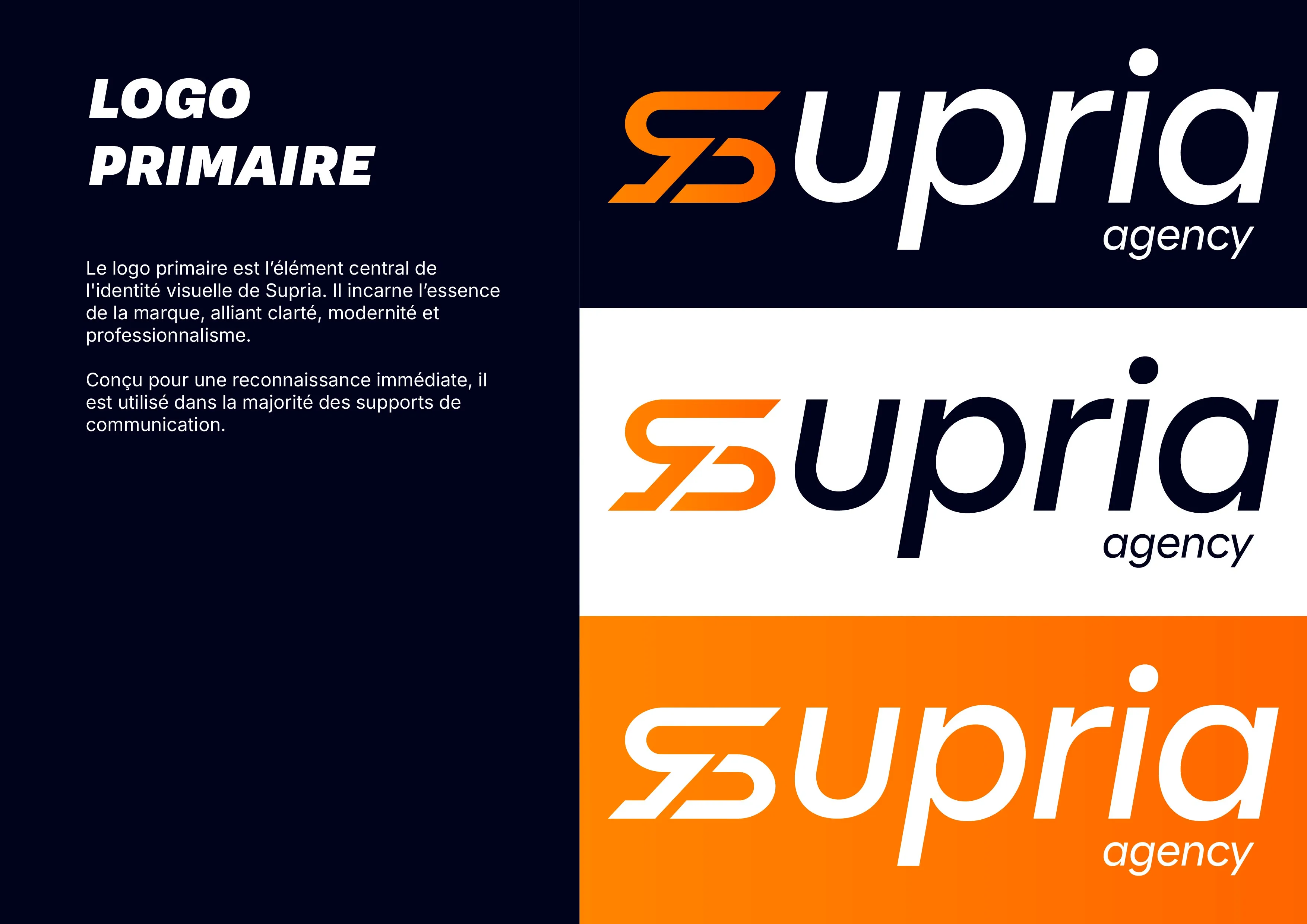 Ce logo reflète une agence jeune, flexible et ancrée dans la création numérique. La fusion entre le "S" et le "u" apporte une cohérence graphique, tout en renforçant l’identité.s de collaboration, clarté et créativité que je souhaite incarner avec Supria.