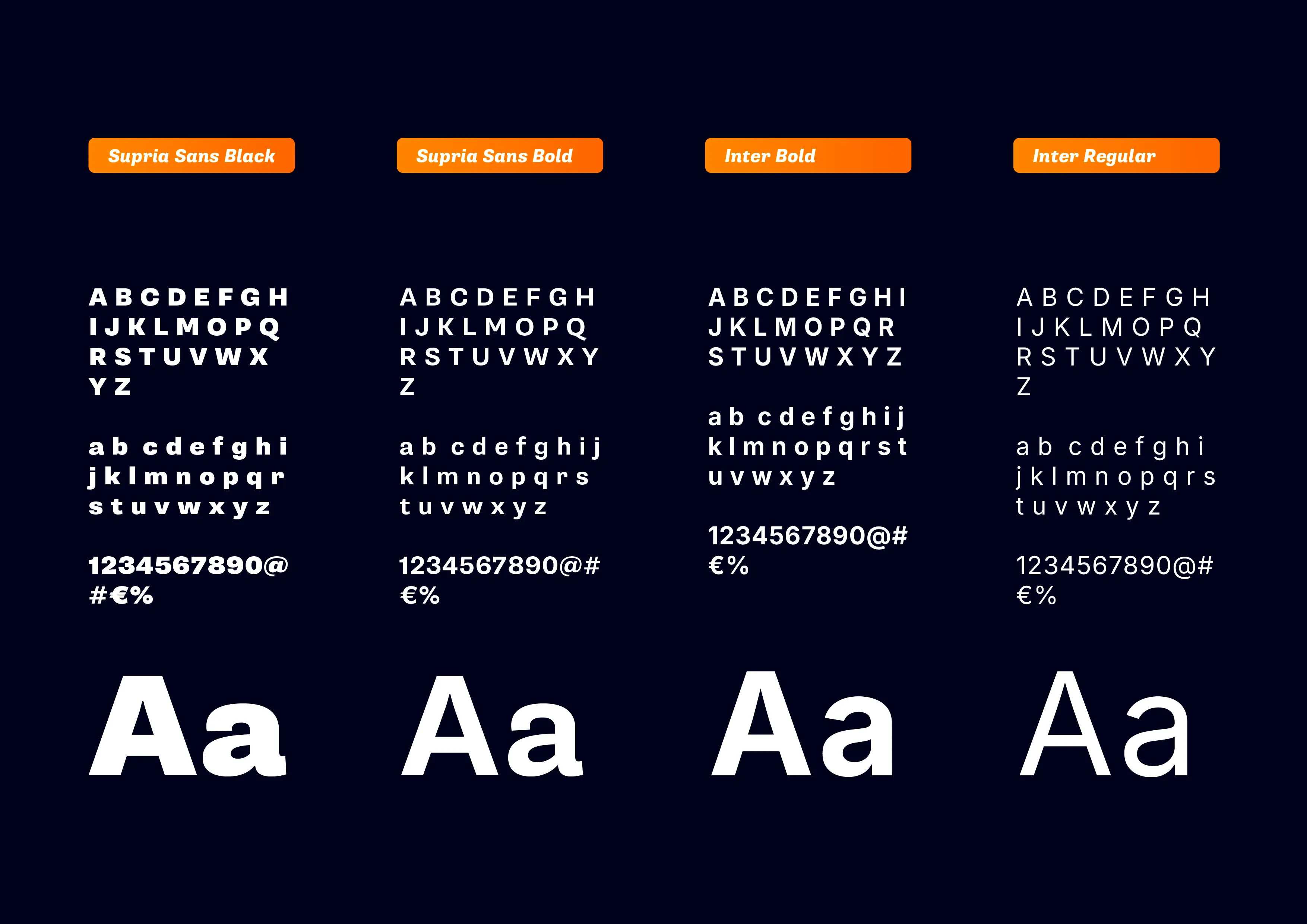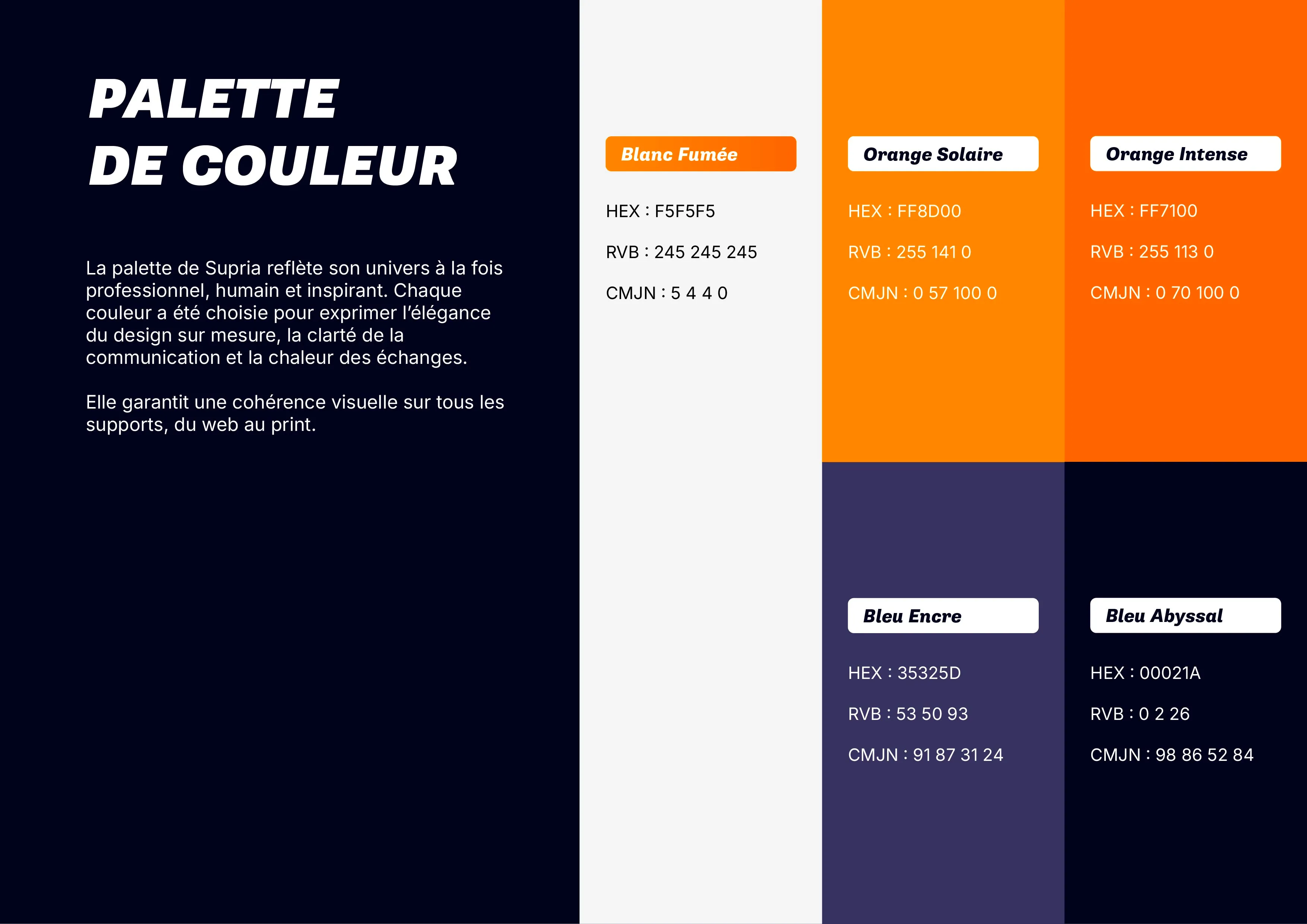 J’ai sélectionné deux typographies complémentaires : une sans-serif élégante pour les titres (pour affirmer la modernité de Supria), et une police plus neutre et lisible pour les textes courants. L’ensemble assure une hiérarchie claire et une grande lisibilité, quel que soit le support.