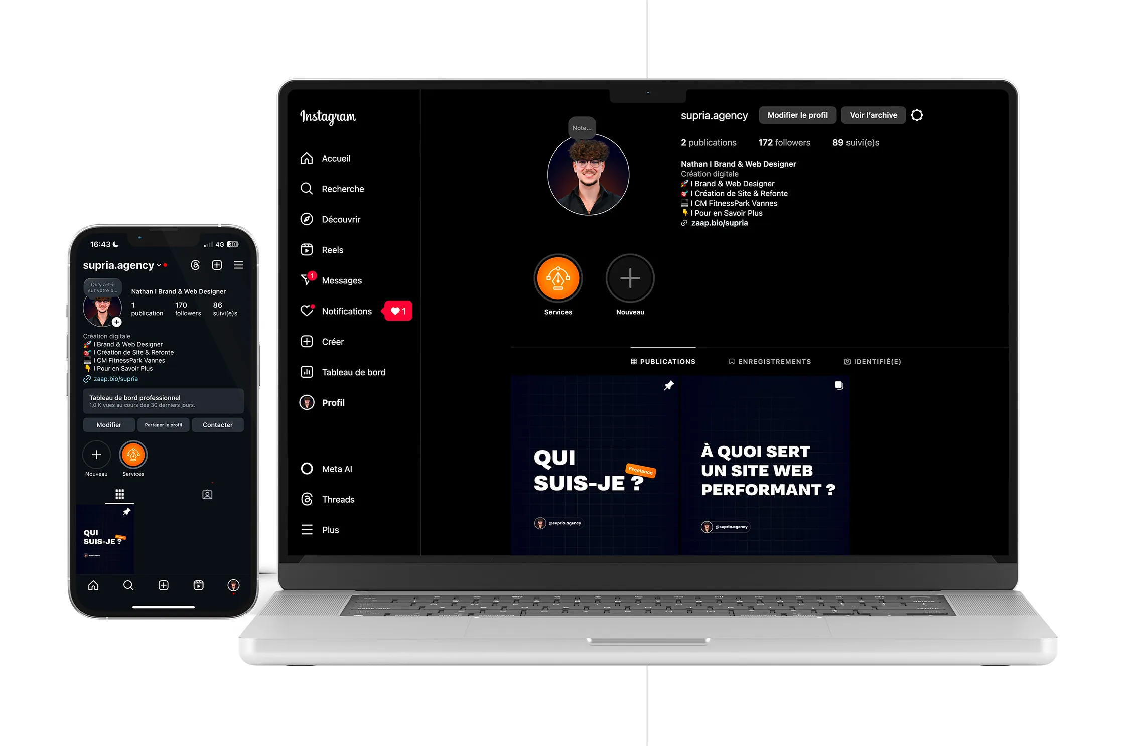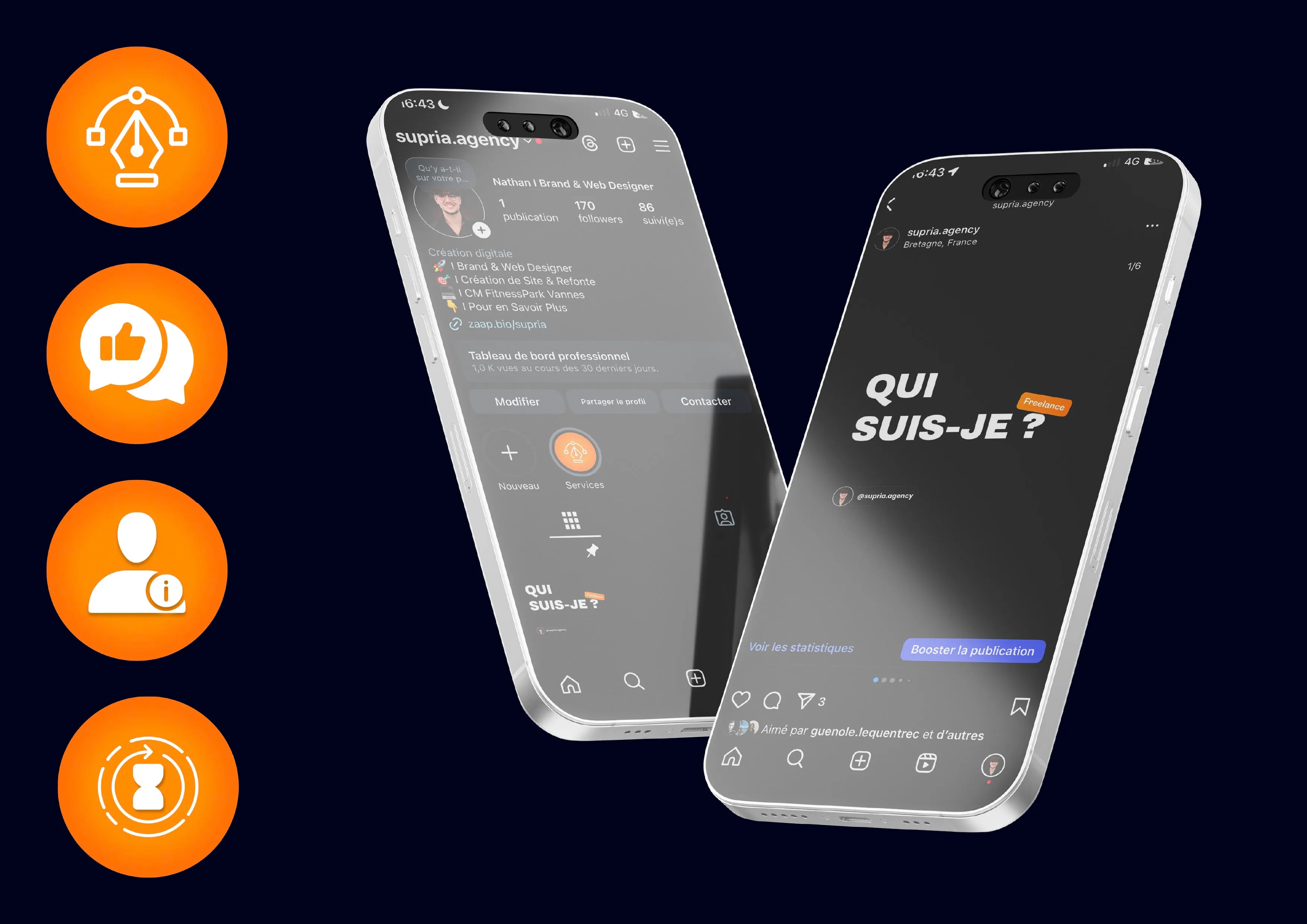 J’ai créé un compte Instagram professionnel avec une biographie claire, une photo de profil alignée avec la charte et une grille harmonisée. Des stories à la une et des carrousels ont été pensés pour décliner visuellement l’univers de Supria et faciliter la lecture du feed.