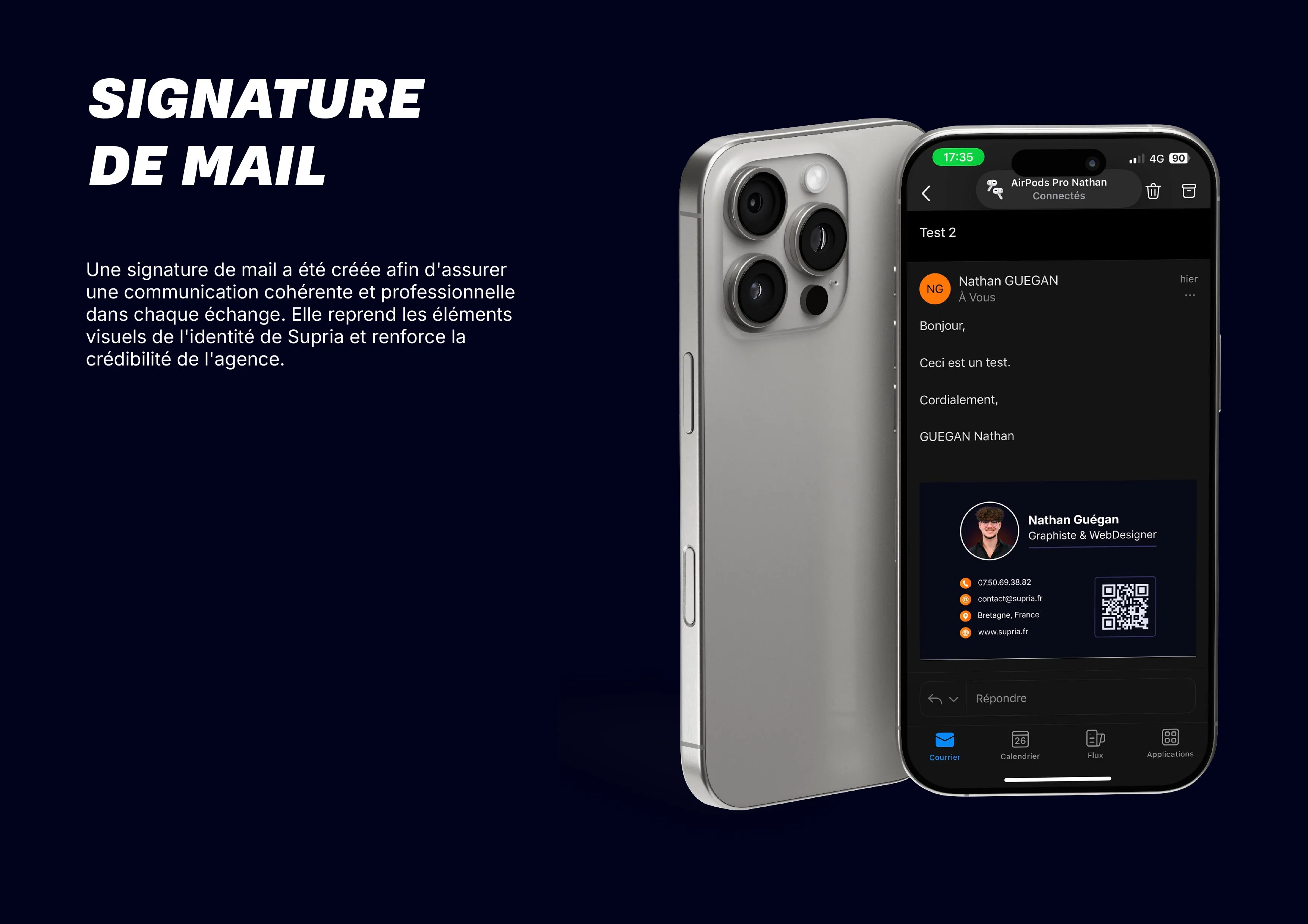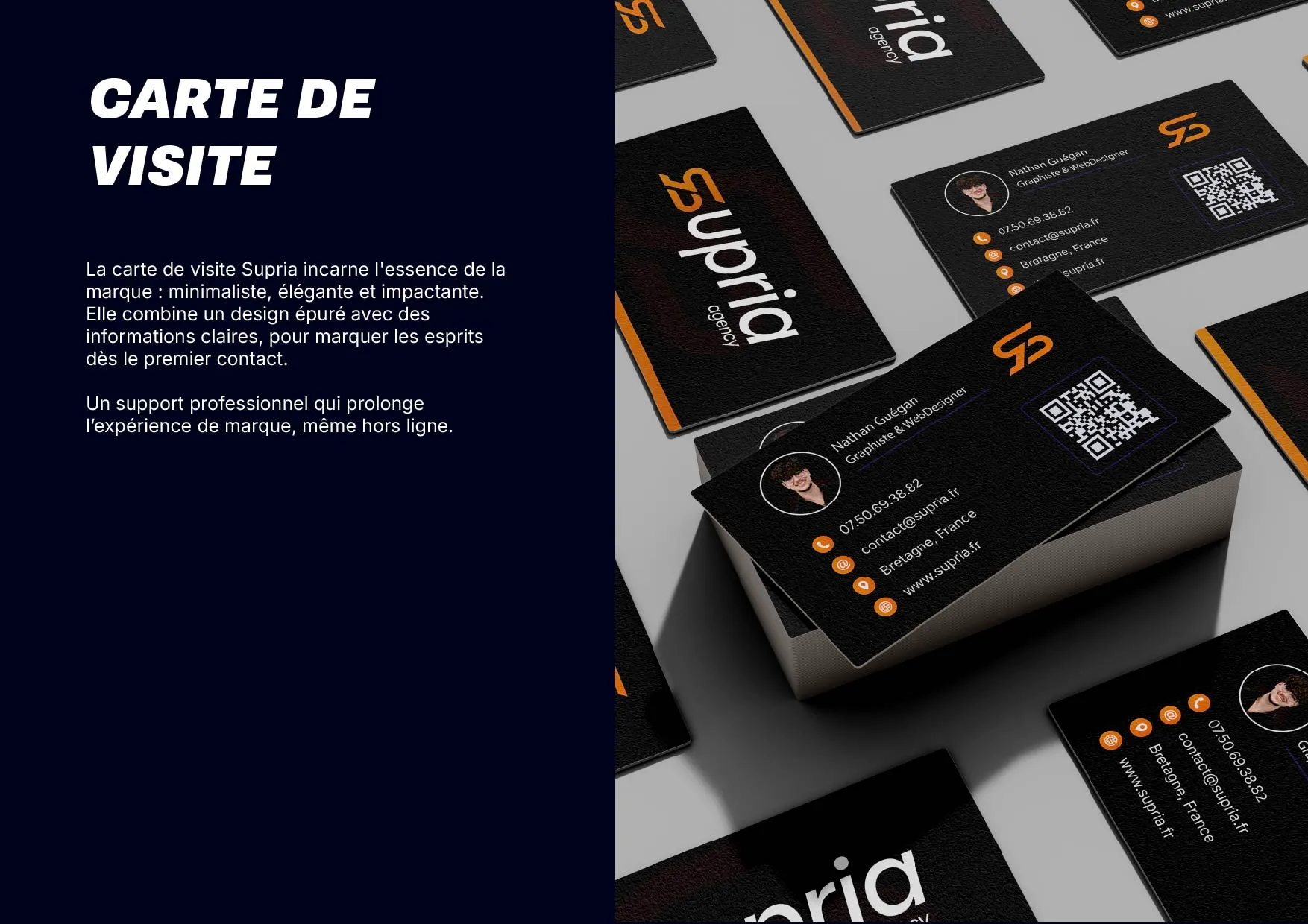 Durant ce projet, j’ai assuré la production de nombreux supports créatifs, structurés autour de l’identité de Supria. Chaque livrable avait un objectif précis : renforcer la crédibilité de la marque, attirer des prospects et poser une base solide pour le développement futur de l’agence.