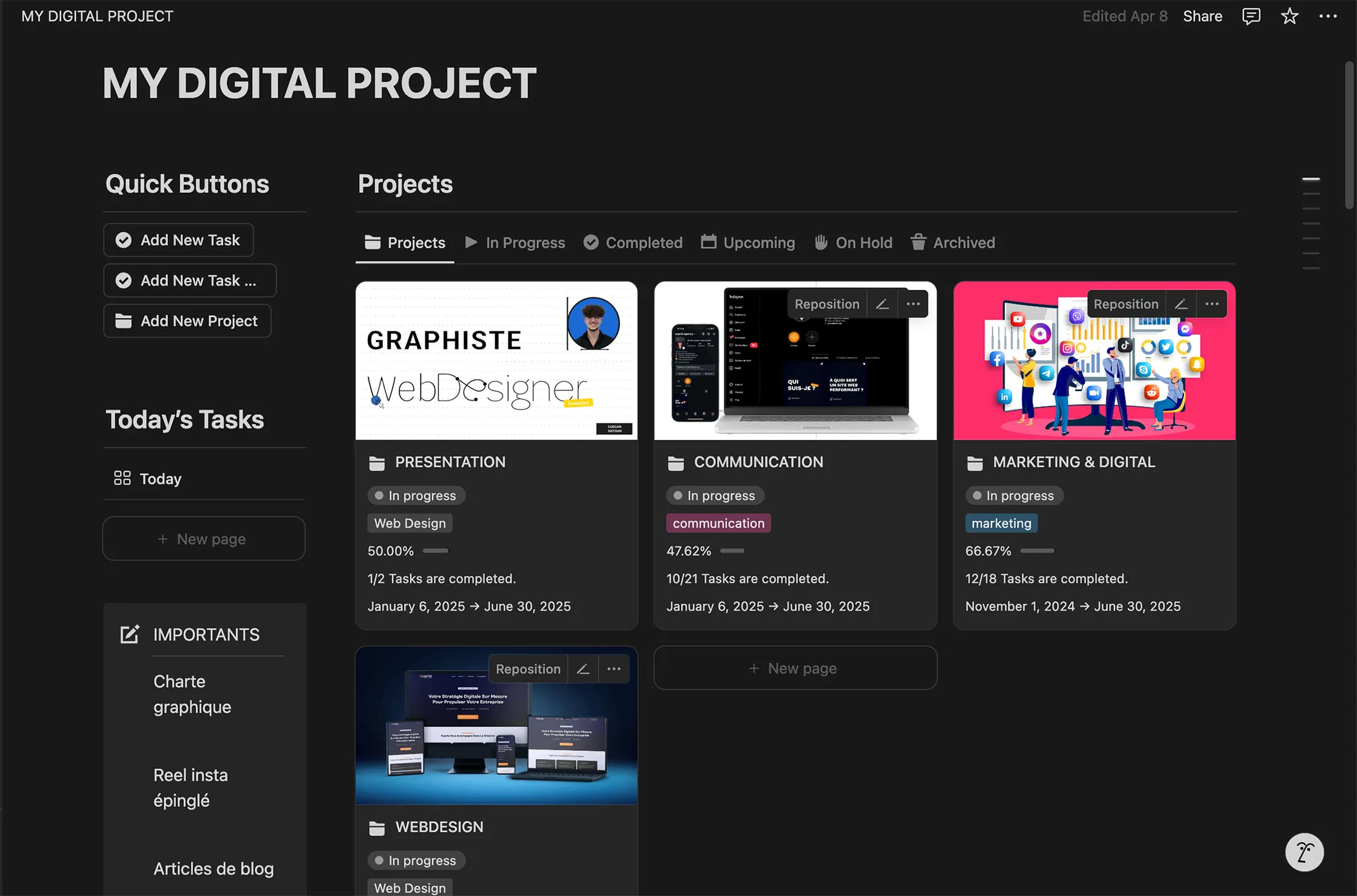 Pour piloter efficacement le projet Supria tout au long de l’année, j’ai mis en place un planning Gantt détaillé sur Notion, structuré autour des 4 pôles clés du projet : Webdesign, Communication, Marketing, Présentation. Cette répartition m’a permis d’avoir une vision claire des délais, de prioriser les tâches et de suivre l’avancement de chaque livrable en temps réel.